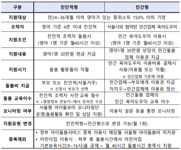 4. 서울형 아이돌봄비 지원 유형별 비교
